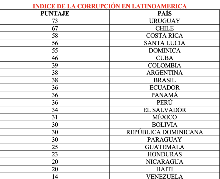 Cuba por debajo de 50, con 46 puntos, le sigue Colombia con 39, Argentina Y Brasil comparten el 38, Ecuador, Panamá y Perú comparte el 36, El Salvador con 34, México con 31, Bolivia, República Dominicana y Paraguay alcanzan 30, Guatemala con 25, Honduras con 23, Nicaragua y Haiti con 20 hasta llegar al más corrupto con 14 que es Venezuela.
