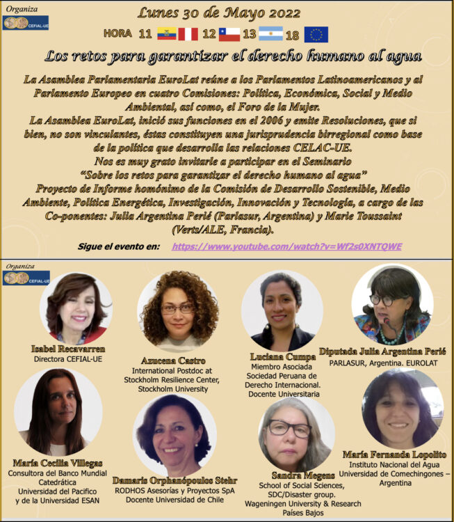 Estás invitad@, «Los retos para garantizar el derecho humano al Agua» Lunes 30 de Mayo horas 11 de Perú, 12 de Chile, 13 de Argentina, 18 de la Unión Europea. La visión de las Mujeres Latinoamericanas sobre el AGUA.