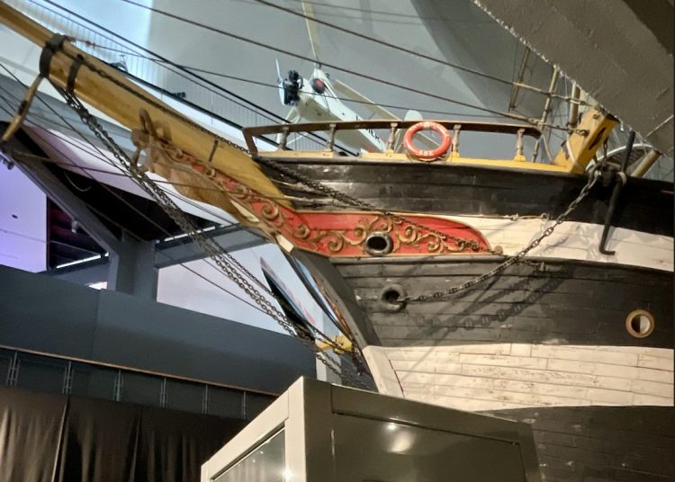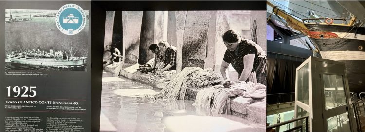 La prua dello storico transatlantico Conte Biancamano, oggi conservata come parte del percorso museografico. Il legno, le corde tese e i dettagli ornamentali evocano l’epoca in cui queste navi erano vere città galleggianti: simboli di migrazione, commercio e modernità.