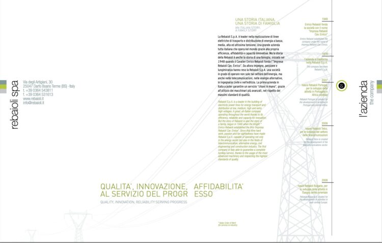 REBAIOLI nasce nel 1948 quando il Cav. Enrico Paolo Rebaioli, dopo una lunga esperienza nel settore delle opere civili, fonda insieme ai suoi familiari l’Impresa Rebaioli. Enrico Paolo crea un piccolo stabilimento industriale con sede a Darfo Boario Terme – Brescia (Italia).