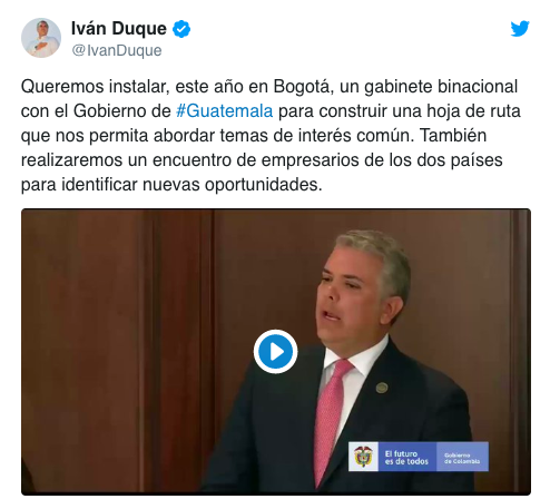 El Presidente de Colombia, Iván Duque Márquez, intercambia saludos con el nuevo Presidente de Guatemala, Alejandro Giammattei, quien fue elegido el pasado 11 de agosto.
