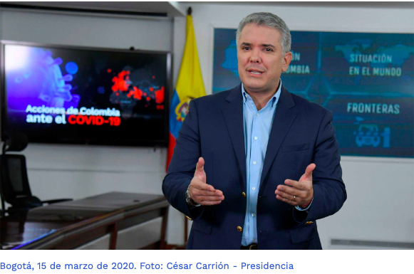 “En nuestras manos –de todos– está la respuesta. Cada uno de nosotros tiene que poner de su parte. Es nuestra obligación como colombianos, cuidarnos los unos a los otros”, manifestó el Presidente de la República, Iván Duque Márquez, explicó además las medidas adoptadas en el país frente a la pandemia del coronavirus.