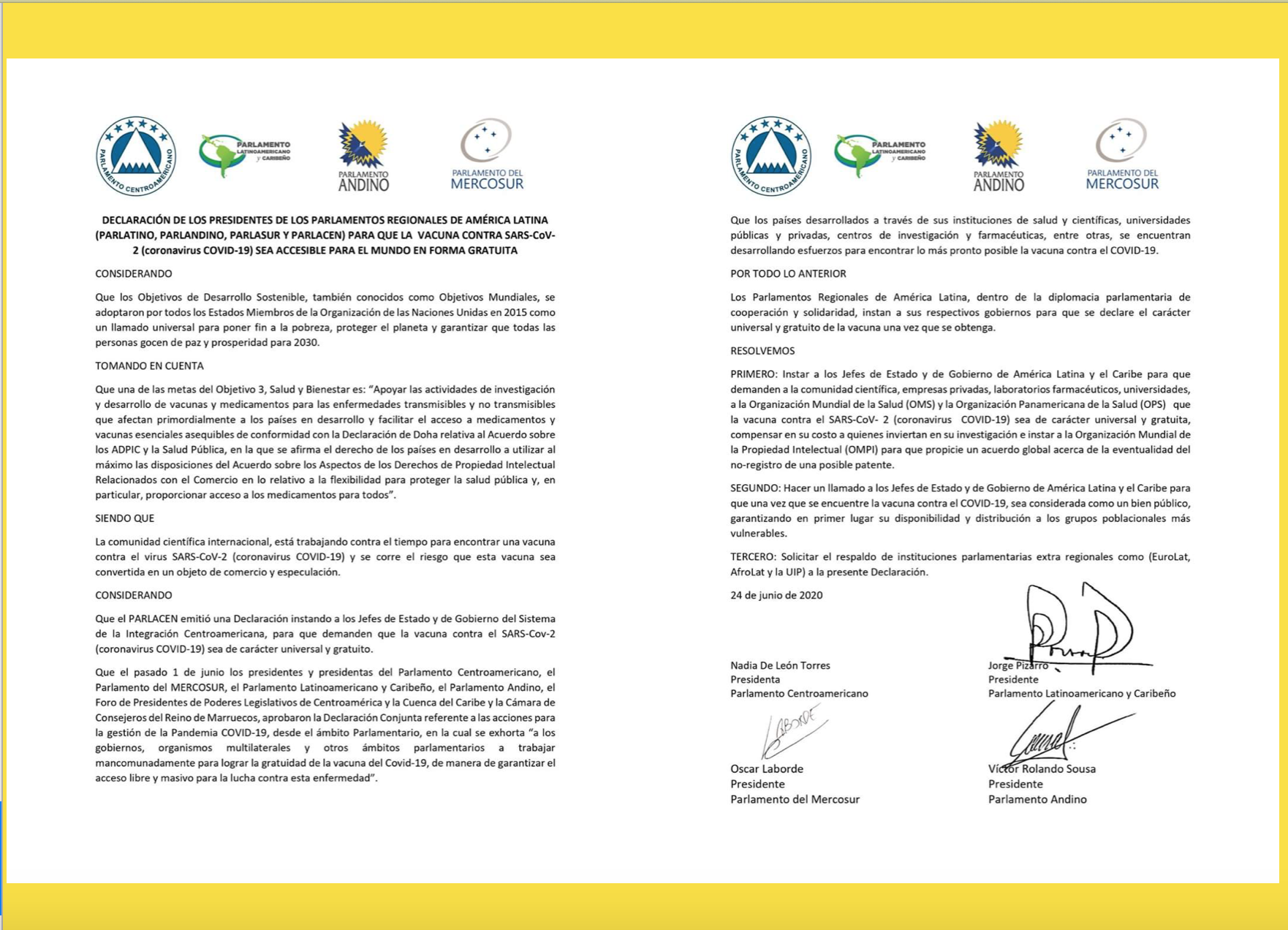Por ello, los Parlamentos latinoamericanos reunidos instan a los Jefes de estado y de Gobierno de la región latinoamericana que demanden a la comunidad científica, empresas privadas, laboratorios farmacéuticos, universidades, Organización mundial de la salud así como a la Organización Panamericana de la Salud que la vacuna contra la SARS-COVID2 o COVID 19 sea “gratuita” y con carácter mundial aunque ellos señalan universal, que sus costes sean cubiertos, en particular, el trabajo referido a los investigadores.