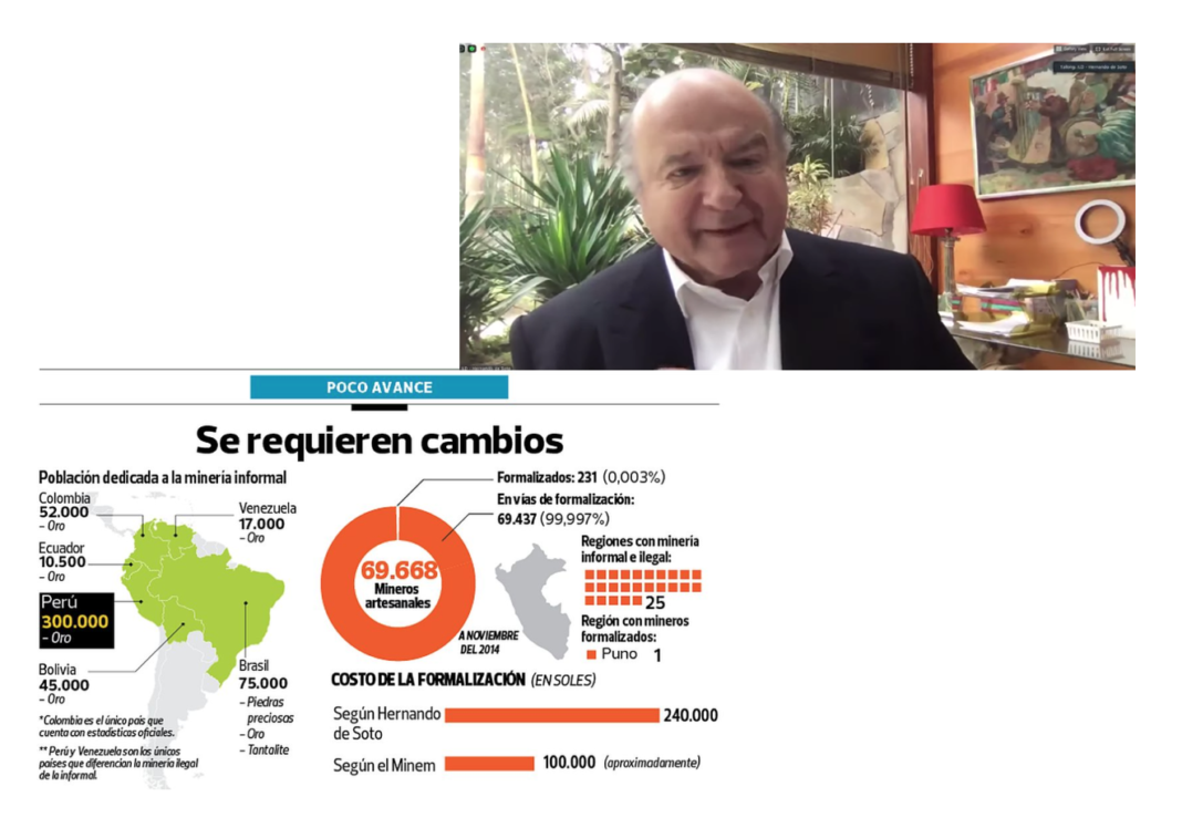 Comparó la cooperación europea hacia el Perú y hacia América Latina ascendente a $1,5000 millones, cuando nuestras reservas son cien mil veces más que lo que nos da la Unión europea. En otras palabras, la mayor parte de los recursos que necesitamos están controlados por los informales, y el propietario del suelo puede exigir ser parte de la acción minera, 2 millones de personas en el Perú no son considerados. Agregando que si hoy en día se desbloqueasen las trabas del Estado a la explotación por los informales y evitaríamos la venganza de los informale podríamos multiplicar por 70 veces el presupuesto del Estado, sólo refiriéndose al sector minero sin hablar del sector agrícola.