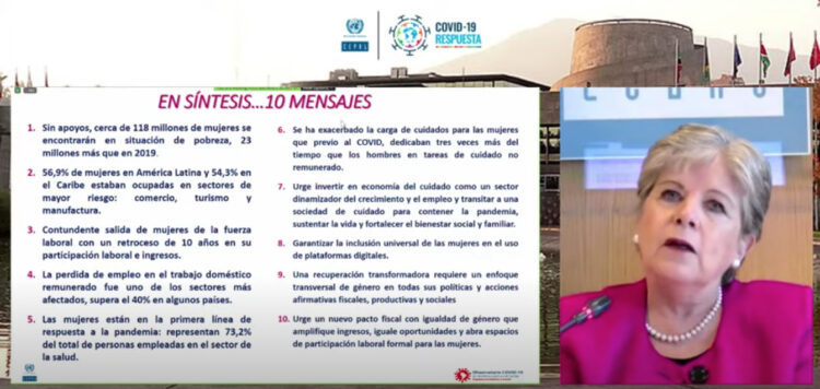 La División de Asuntos de Género de la CEPAL preparó un Informe sobre la Autonomía económica de las Mujeres, Alicia Bárcena, Secretaria Ejecutiva de la Comisión Económica para América Latina y el Caribe (CEPAL), presentó este Informe Especial COVID-19 N⁰9. Un informe que presenta el retrato de la ocupación remunerada de la Mujer Latinoamericana antes de la pandemia, ellas dedicaban una tercera parte de su tiempo en el cuidado. El confinamiento ha dramatizado su situación.