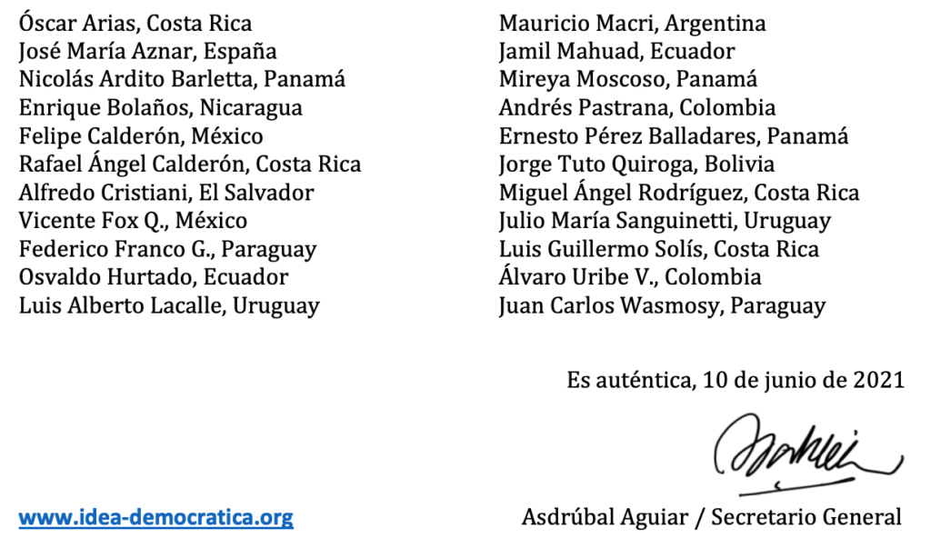 Acto seguido la Iniciativa Democrática de España y las Américas (IDEA) foro internacional no gubernamental integrado por 37 ex Jefes de Estado y de Gobierno, quienes propugnan el respeto del principio de la alternabilidad durante sus desempeños, redactaron la siguiente carta: