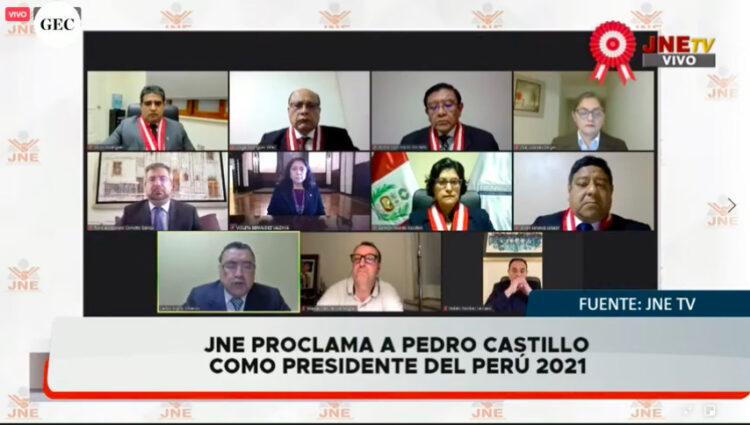 En ceremonia virtual, el Jurado Nacional de Elecciones (JNE) proclamó al maestro José Pedro Castillo Terrones como presidente de la República para el periodo 2021-2026. En presencia del pleno del Jurado Nacional de Elecciones, se leyó el acta general con los pormenores de los resultados.