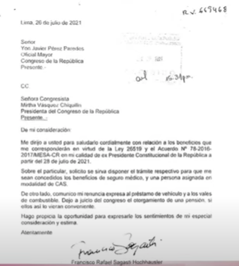Hoy, 29 de Julio, los hechos nos dan razón, cuando ha sido publica esta carta dirigida por Francisco Sagasti al Congreso de la República peruana. Lamentable, un Congresista no elegido para ser presidente, propuesto de acuerdo con su partido político para ocupar transitoriamente y por emergencia la presidencia de la República por menos de nueve meses no ver el servicio público como lo que es: Servicio Público sino salir del tratamiendo de un Congresista, para lo cual fue elegido, y pretender privilegios.