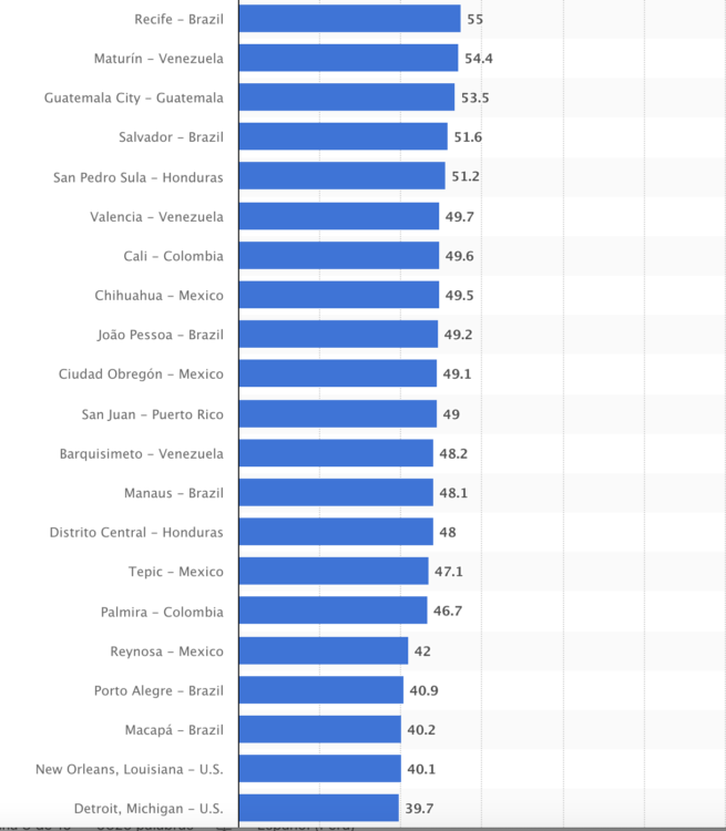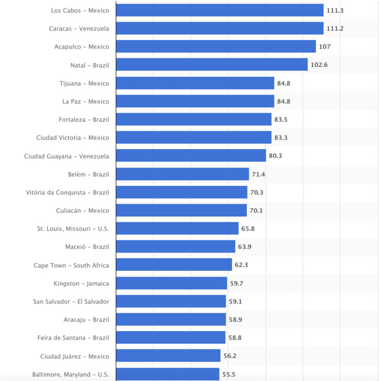 La mayoría de las ciudades más peligrosas del mundo se encuentran en América Latina. La ciudad mejor clasificada fuera de América Latina es St. Louis en los Estados Unidos, que ocupa el decimotercer lugar con una tasa de homicidios de 60,59 en 2018. Detroit, con una tasa de homicidios de 39,7, ocupó el cuadragésimo segundo lugar.
