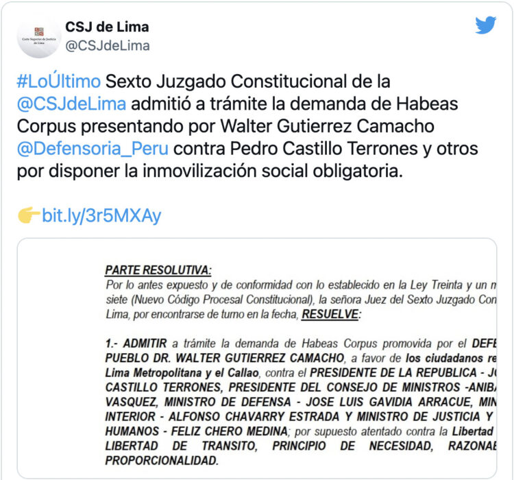 El Defensor del Pueblo, Walter Gutiérrez, presentó un Habeas Corpus para anular la inmovilización social obligatoria decretada por el gobierno de Pedro Castillo.