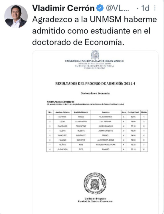 El Jefe del partido Perú Libre, Vladimir Cerrón: «La única solución para el país es la Asamblea Constituyente», según él así fijarían los precios de los alimentos y volvernos una Cuba o una Venezuela. Tal vez motivado por sus deficiencias, se presentó a la UNM San Marcos al Doctorado de Economía, salió en el primer lugar, la Rectora anuló el concurso por fraude. Si por dónde pasan….. dejan huella.