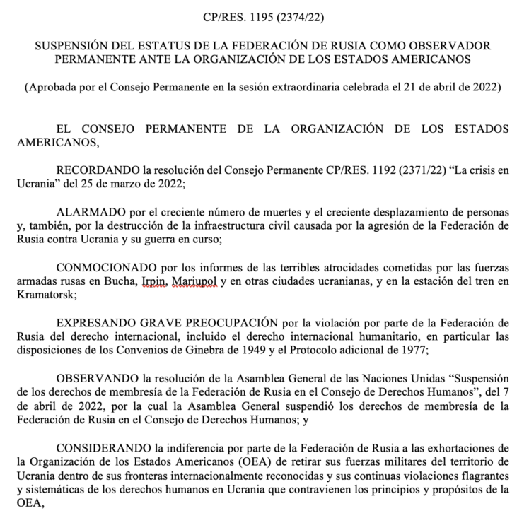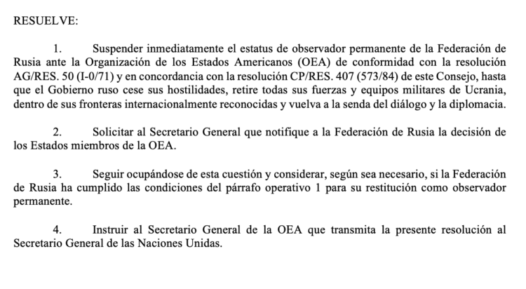 Consejo Permanente de la OEA suspende a Rusia como Observador