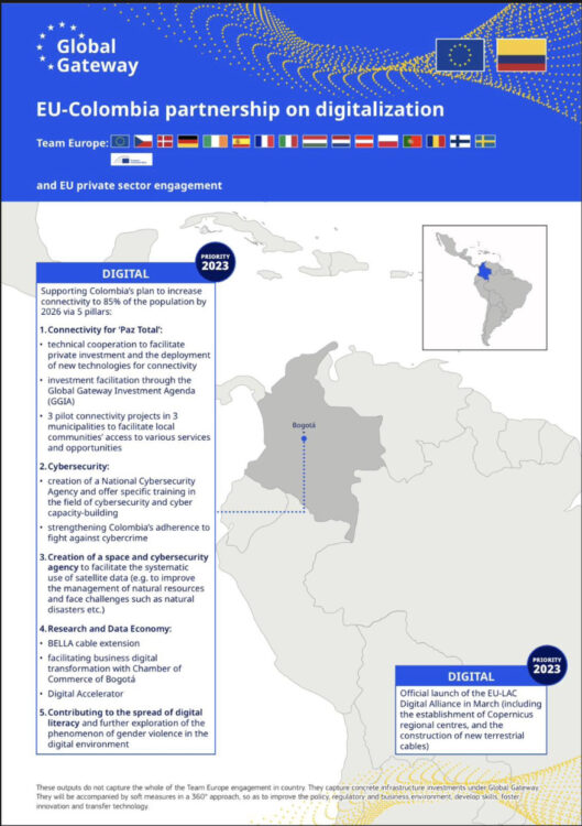 • Sobre la conectividad, la Unión Europea manifestó su compromiso de movilizar apoyos para facilitar el cumplimiento del plan del Gobierno para conectar al 85% de la población y, a través de él, facilitar la presencia del Estado en los territorios y el proceso de paz. El apoyo europeo, a través de la cooperación técnica y financiera, ayudará a aumentar la conectividad, pero también a garantizar la resiliencia y seguridad de las redes y, en última instancia, a reducir las desigualdades.