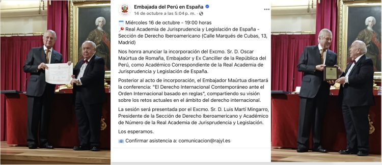 El Presidente de la Sociedad Peruana de Derecho Internacional, Embajador Óscar Maúrtua de Romaña, formalizó su incorporación en la Real Academia de Jurisprudencia y Legislación de España (RAJYLE), con sede en Madrid. El referido evento se llevó a cabo el 16 de octubre, donde el Embajador Maúrtua brindó una exposición titulada El Orden Internacional Basado en Reglas y su desarrollo frente al Derecho Internacional Contemporáneo, en el marco de una nueva arquitectura internacional multipolar.