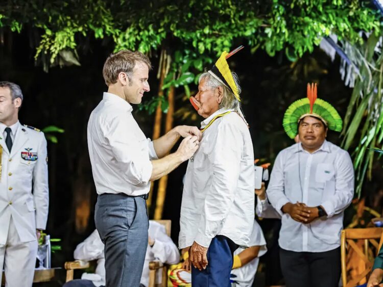 Después de un viaje en barco por la isla Combu, los dos presidentes participaron de una ceremonia en la que el cacique Raoni Metuktire, líder del pueblo Kayapó y uno de los representantes indígenas más reconocidos internacionalmente, fue condecorado con la orden de caballero de la Legión de Honor francesa, el principal honor que concede Francia a sus ciudadanos y extranjeros que destacan en el escenario mundial.