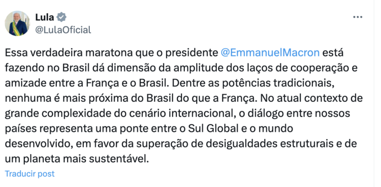«Brasil no está negociando con Francia. El Mercosur está negociando con la Unión Europea. No es un acuerdo bilateral entre Brasil y Francia, es un acuerdo comercial entre dos conjuntos de países. Por un lado, la Unión Europea, con sus países «... Del otro lado, el Mercosur. Obviamente, después de la decisión de la Unión Europea [de aprobar el acuerdo], «si Macron tiene que pelear con alguien, no es con Brasil, es con la Unión Europea. Es con los negociadores que fueron elegidos para negociar, no depende de mí. El acuerdo, tal como se propone ahora, es mucho más prometedor de firmar que el otro. Pero, obviamente, así como Brasil tenía derecho a estar en contra de la otra propuesta, Emmanuel Macron tiene derecho a estar en contra de la [ nueva] propuesta», afirmó Lula.