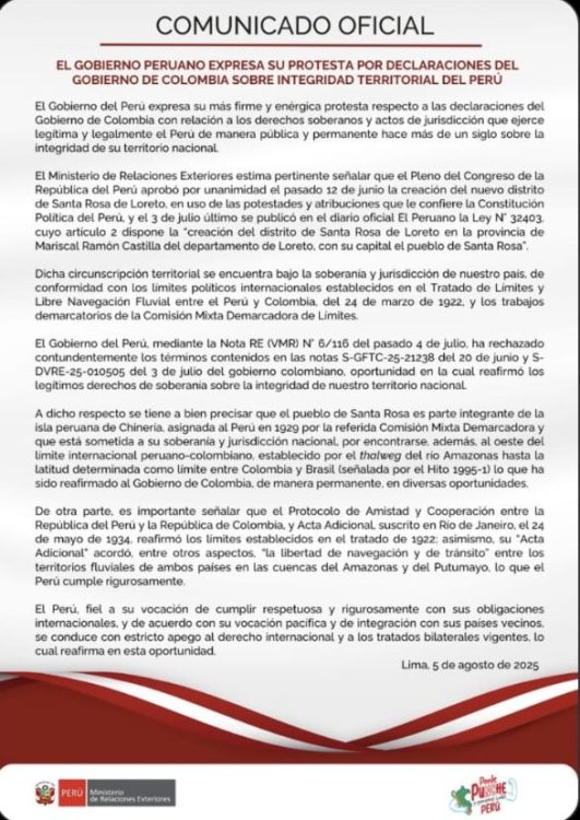 El Gobierno del Perú, mediante la Nota RE (VMR) N° 6/116 del pasado 4 de julio, ha rechazado contundentemente los términos contenidos en las notas S-GFTC-25-21238 del 20 de junio y S-DVRE-25-010505 del 3 de julio del Gobierno colombiano, oportunidad en la cual reafirmó los legítimos derechos de soberanía sobre la integridad de nuestro territorio nacional.