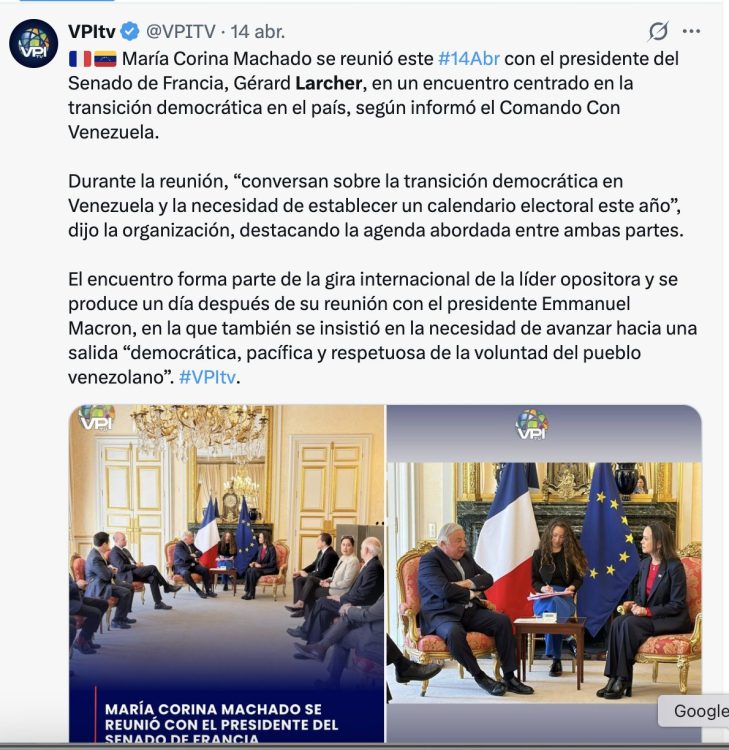 Desde allí viajó a París, donde fue recibida por Gérard Larcher, presidente del Senado francés. Tras el encuentro, Larcher declaró que la elección presidencial de 2024 fue “robada”, pidió establecer un calendario electoral este año y reiteró la preocupación de Francia por las violaciones de derechos humanos en Venezuela.
