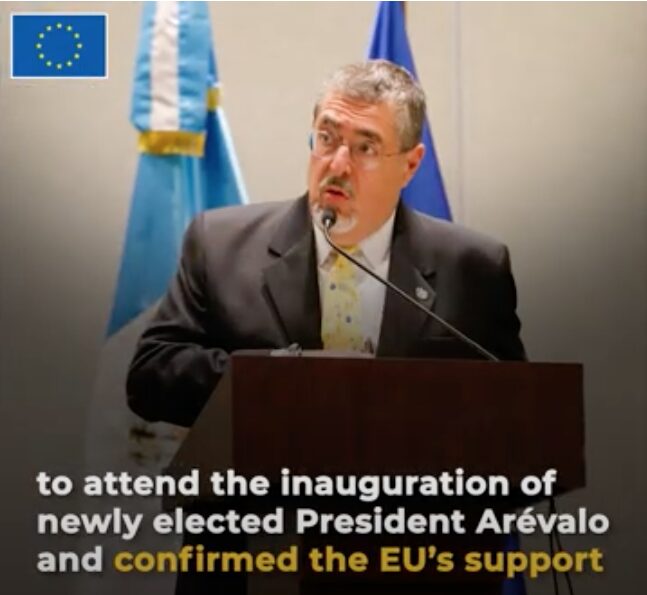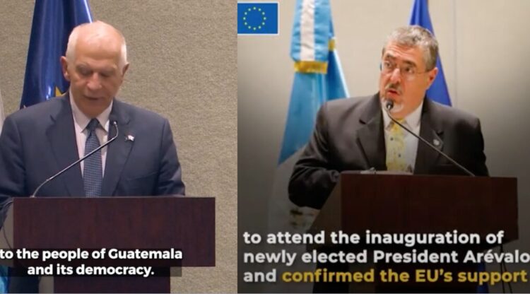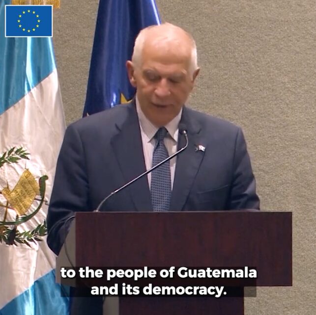 Con relación a la presidencia de Guatemala, ciudad a la cual Josep Borrell asistió en representación de los 27 países de la Unión para la toma de posesión del presidente Arévalo, toma de mando que se vio amenazada por fuerzas contrarias a la democracia y al voto democrático de los guatemaltecos. El AR/VP manifestó «es un gran honor para mí señor presidente electo estar en Guatemala en este momento histórico para asistir representando la Unión Europea en la toma de posesión del presidente Bernardo Arévalo tras su clara victoria en las pasadas elecciones. Esta visita que es la primera de un alto representante de la unión a Guatemala es una muestra de nuestro respaldo al nuevo gobierno del presidente Arévalo, pero también es la demostración del compromiso firme de la Unión Europea con el pueblo de Guatemala y su democracia, una democracia que ha estado amenazada y que estamos aquí para defender y apoyar quiero destacar el papel que jugó nuestra Misión de observación electoral y la posición firme de la unión en defensa de los resultados electorales y la adopción ayer mismo por parte del Consejo de la Unión Europea de un marco jurídico de sanciones, que podrá ser aplicado contra los que dificulten el normal desarrollo del proceso democrático en Guatemala quiero aclarar y subrayar que