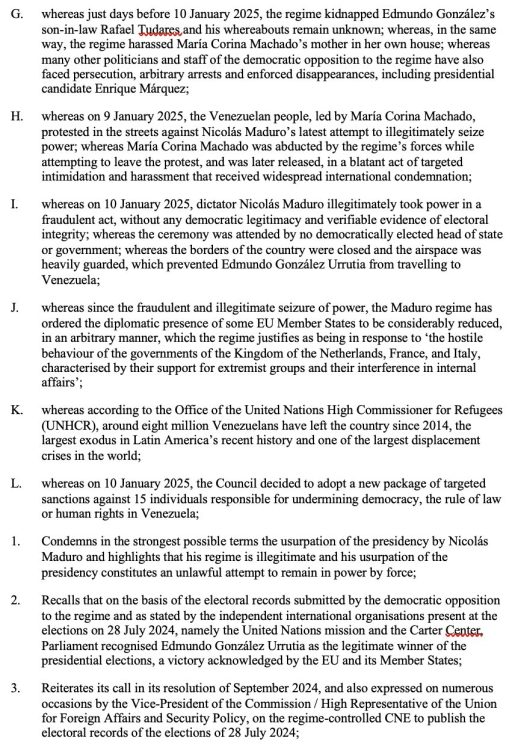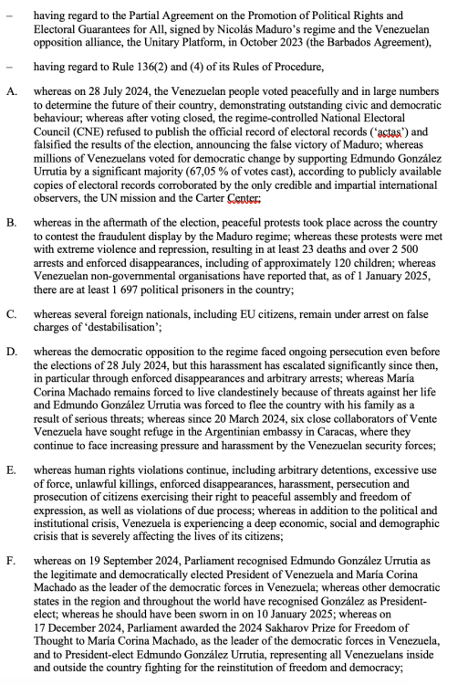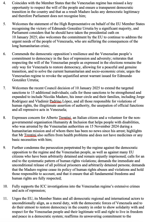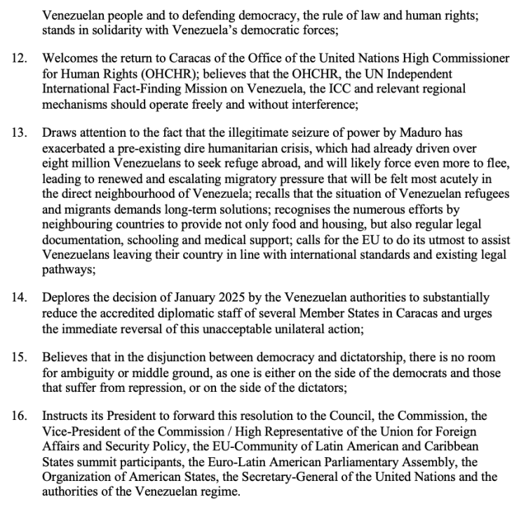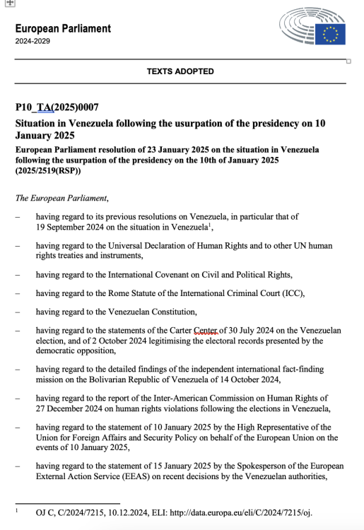 El Parlamento Europeo, que reconoció a Edmundo González Urrutia como el ganador legítimo de las elecciones presidenciales, señala que el régimen venezolano ha perdido una oportunidad decisiva para respetar la voluntad del pueblo y asegurar una transición democrática transparente. «Maduro carece de legitimidad democrática y, por lo tanto, el Parlamento no lo reconoce», recalca el texto.