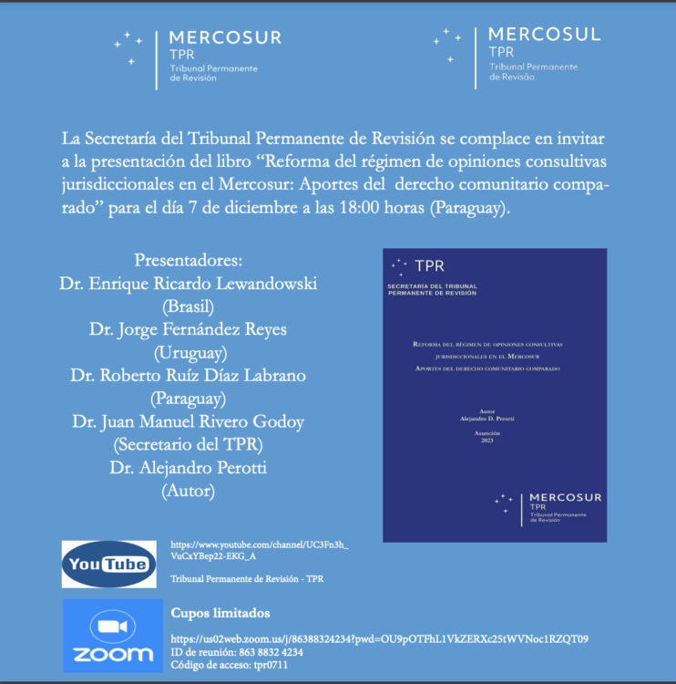 Mucho me complace invitarlos a la presentación de mi libro “Reforma del régimen de opiniones consultivas jurisdiccionales en el Mercosur: Aportes del derecho comunitario comparado”, que realizará la Secretaría del Tribunal Permanente de Revisión (TPR), el 7 de diciembre a las 18:00 horas (Paraguay; misma hora en Argentina).