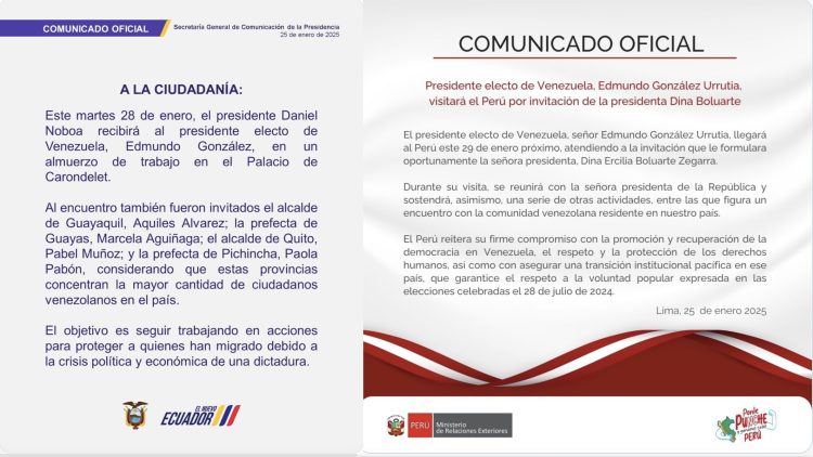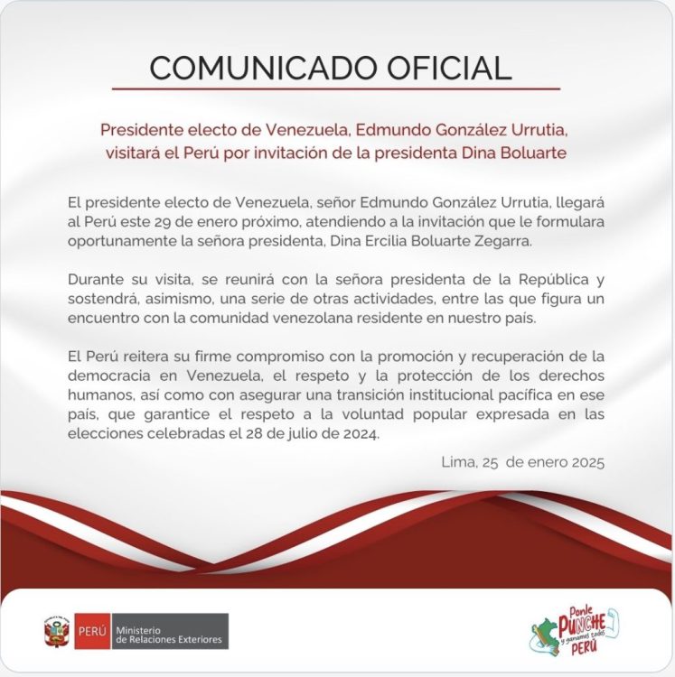 El presidente electo de Venezuela, señor Edmundo González Urrutia, llegará al Perú este 29 de enero próximo, atendiendo a la invitación que le formulara oportunamente la señora presidenta, Dina Ercilia Boluarte Zegarra.