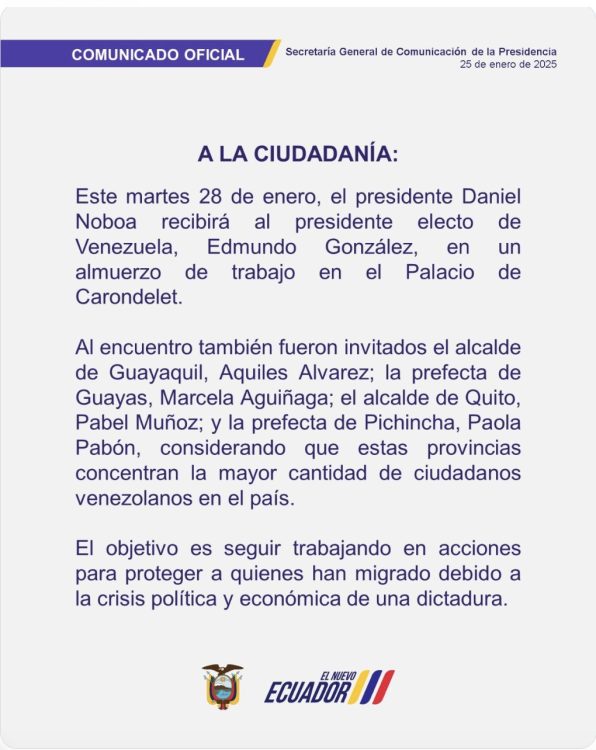 El día anterior, el 28 de enero, González Urrutia, será recibido en Ecuador por el presidente Noboa.