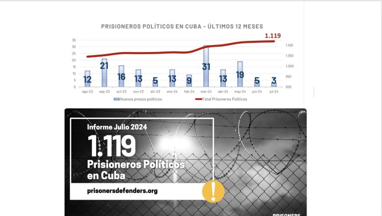 Con cierre de datos a fecha 31 de julio de 2024, la lista de prisioneros políticos en Cubacontiene un total de 1.119 prisioneros políticos y de conciencia sufriendo condenas judiciales o disposiciones de limitación de libertad por parte de las fiscalías sin supervisión judicial alguna, debido proceso o defensa efectiva, en flagrante violación de la ley internacional, lista que cada mes hacemos pública y distribuimos en todos los ámbitos políticos, diplomáticos y de defensa de los derechos humanos. En los últimos 12 meses (1 de agosto de 2023 a 31 de julio de 2024) la lista de prisioneros políticos de Cuba sumó un total de 160 nuevos presos políticos (un promedio de más de 13 presos políticos nuevos cada mes). Esto supone que a lo largo de estos 12 meses estuvieron presentes en la lista un total de 1.193 prisioneros políticos, recordamos una vez más, todos ellos torturados.