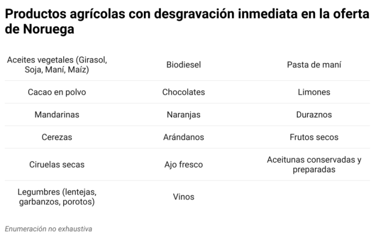 Con relación al comercio agrícola, la oferta suiza incluye el 91% de las exportaciones del MERCOSUR a ese país y el 58% de las líneas arancelarias. En el caso de Noruega, su oferta agrícola incluye 95% de las exportaciones del MERCOSUR y 64% de las líneas arancelarias.