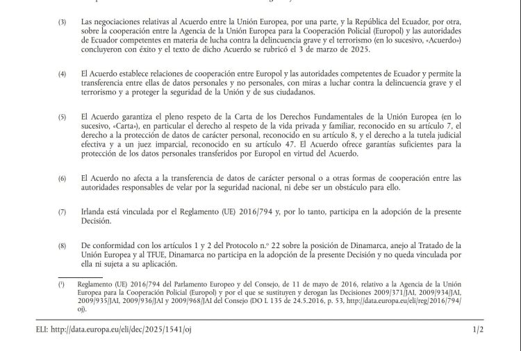 [2] Working Arrangement between the Ministry of Interior of the Republic of Ecuador and the European Union Agency for Law Enforcement Cooperation [Acuerdo de Trabajo entre el Ministerio del Interior de la República del Ecuador y la Agencia de la Unión Europea para la Cooperación Policial], disponible en https://www.europol.europa.eu/partners-collaboration/agreements/ecuador.