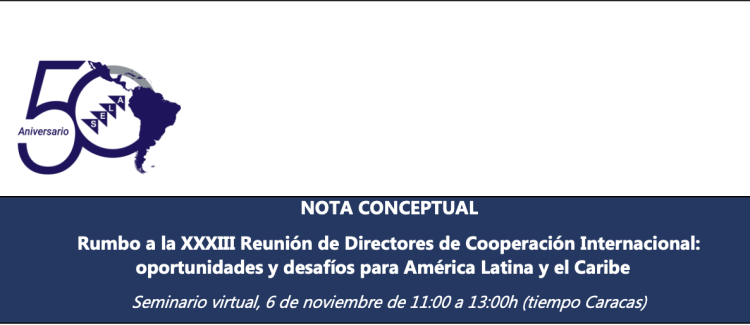 Dada la relevancia de la “XXXIII Reunión de Directores de Cooperación Internacional de América Latina y el Caribe”, que el SELA coorganiza con la Agencia Mexicana de Cooperación Internacional para el Desarrollo (AMEXCID), aunado a su reprogramación en 2026 y como antesala a la misma, el próximo 6 de noviembre, se celebrará el Webinar «Rumbo a la XXXIII Reunión de Directores de Cooperación Internacional: oportunidades y desafíos para América Latina y el Caribe».