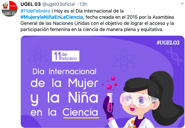 En el Perú, con la asistencia de más de 1000 personas, en su mayoría niñas y adolescentes, se llevó a cabo la feria por el Día Internacional de la Mujer y la Niña en la Ciencia, organizada por el Ministerio de la Mujer y Poblaciones Vulnerables (MIMP), el Consejo Nacional de Ciencia, Tecnología e Innovación Tecnológica (Concytec); la Municipalidad Metropolitana de Lima, la Embajada Británica, la Asociación Cultural Peruano Británica y el British Council.