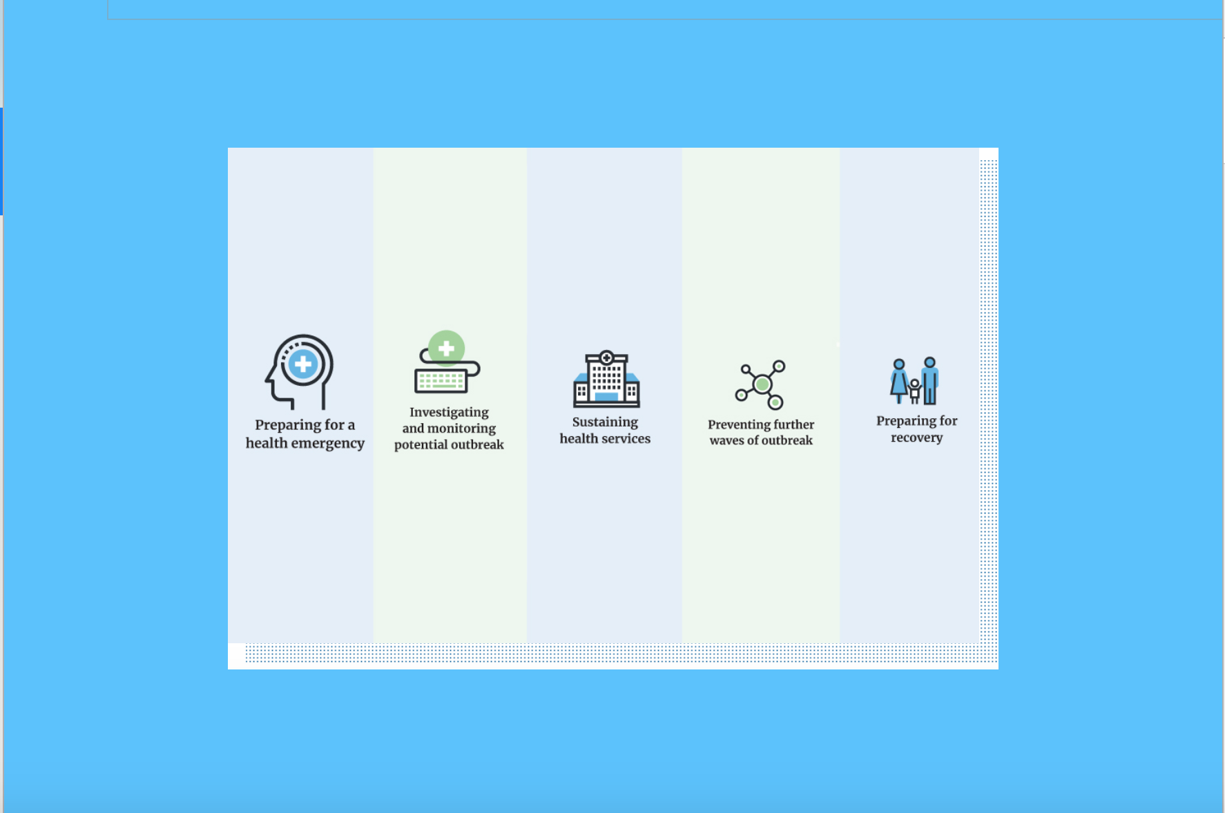 COVID-19 ha subrayado la necesidad de desarrollar un conjunto de herramientas de preparación que identifique las medidas esenciales de salud, así como las acciones políticas que las economías deben emplear de inmediato y durante las diferentes fases de una pandemia.
