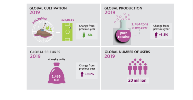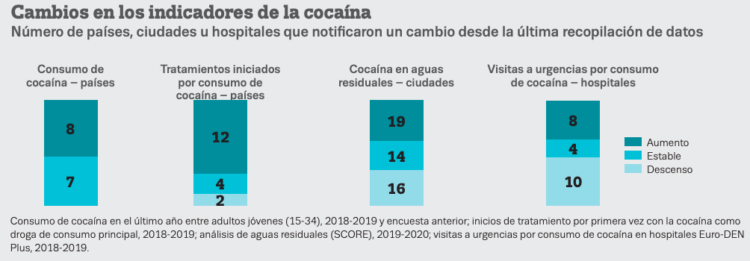 La cocaína sigue siendo la segunda droga ilegal que más se consume en Europa y la demanda de consumo hace que sea una parte lucrativa del comercio de la droga en Europa para los delincuentes. El hecho de que se haya incautado una cantidad récord de 213 toneladas de droga en 2019 indica que una expansión de la oferta en la Unión Europea. La pureza de la cocaína ha ido aumentando durante la última década y el número de personas que inician tratamiento por primera vez ha aumentado en los últimos 5 años. Tanto estos como otros indicadores señalan la posibilidad de que aumenten los problemas relacionados con la cocaína.