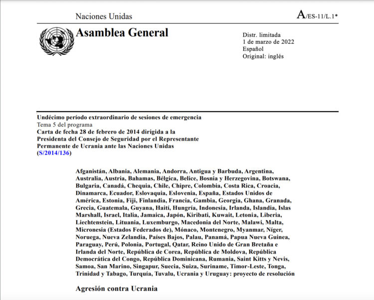 La Asamblea General de la ONU adoptó el miércoles una resolución en la que deplora «en los términos más enérgicos la agresión de la Federación Rusa contra Ucrania» en violación de la Carta de la ONU y exige que Rusia «cese inmediatamente su uso de la fuerza» contra el país de Europa del Este.