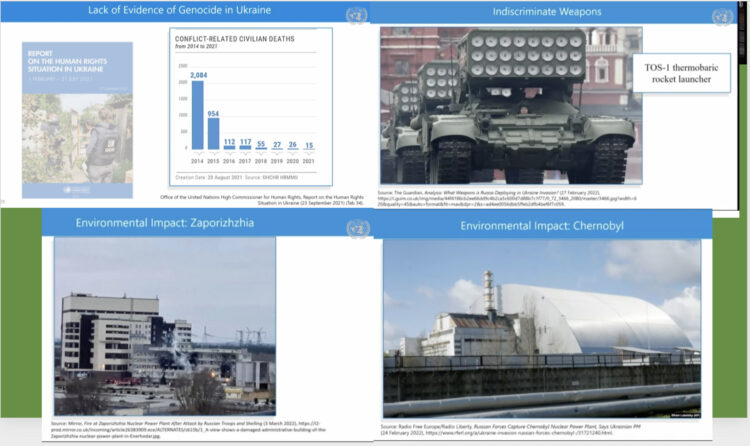 Las fotos presentadas, de la destrucción de las ciudades, los civiles muertos en el camino, hacen ver que la acusación de Putin y de la Federación Rusa fue una distracción y más bien está en curso un genocidio contra Ucrania. Mientras, tanques que desfilan con artillería pesada en la parte superior, explican que no es una operación militar pacifica sino, más bien, altamente destructiva.