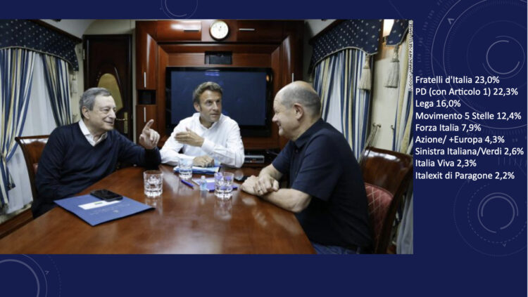 El tiempo es corto para una campaña electoral que elegirá el 25/IX el nuevo gobierno, los jefes de partido recurren a la creatividad: sacudirse de cualquier responsabilidad sobre la caída del gobierno Draghi. La alianza Letta-Conte se deshizo, Conte insiste en continuar, Letta, del Partido Democrático asegura «nunca más con 5*». La derecha con Fratelli d’Italia la lidera ,Giorgia Meloni, soberanista y contra la UE, ha sido el único partido en oposición durante el gobierno Draghi, lidera el voto italiano. Berlusconi y Salvini, la siguen, Berlusconi no quiere respetar el principio establecido «quien recibe más votos nombra el primer Ministro». Meloni, les ha pedido reunirse en sedes institucionales y respetar los acuerdos. Berlusconi, con 85 años, debilitado por la salida de piezas importantes de su partidos, no quiere respetar el principio acordado, se está candidando al Senado, donde ya se ve presidente.