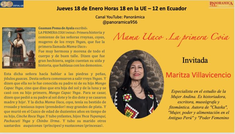 Esta dicha señora hacía hablar a las piedras y peñas, ýdulos guacas. Desta señora comensaron a salir rreys Yngas. Y dizen que ella no le fue conocida su padre ni de su hijo Mango Capac Ynga, cino que dixo que era hija del sol y de la luna y se casó con su hijo primero, Mango Capac Ynga. Para se casar, dizen que pedió a su padre al sol dote y le dio dote y se casaron madre y hijo1. Y la dicha Mama Uaco, coya, tenía su bestido de rrosado y teníasus topos [prendedor] muy grandes de plata. Y que murió en el Cuzco de edad de duzientos años en tienpo de su hijo, Cinche Roca Ynga.Y tubo ynfantes, hijos Ynca Yupanqui, Pachacuti Ynga y Chinbo Urma. Y tubo su marido otros uastardos auquiconas [príncipes] y nustaconas [princesas].