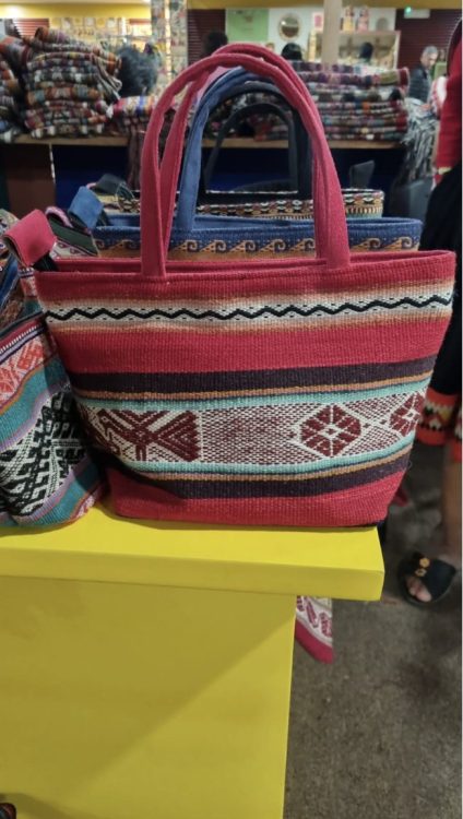 Predomina el trabajo Andino, el tejido plano en material de alpaca siguiendo la técnica ancestral del telar a cintura, previamente, la lana de alpaca es tratada para producir esos vivaces colores que se logran con tintes naturales a base de plantas, semillas, raíces, tallos, flores, hojas e insectos, con cochinilla.