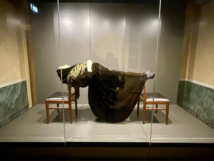 Goshka Macuga (1967), es una artista polaca residente en Londres, conocida por sus actividades multidisciplinarias que comprende escultura, instalaciones fotografía y actuaciones. Esta obra Madame Blavatsky (2007), imagina a la aristocrática rusa del siglo XI, fundadora de la Sociedad Teofísica como un espíritu culto en un momento de éxtasis. Suspendida entre dos sillas, se refiere a los presuntos poderes de levitación y su convicción que los estados de trance fueran portales creativos. Sus manos y la cara están esculpidos en madera, evocan la iconografía religiosa, los vestidos violeta y negro, se refieren al luto y al misticismo.
