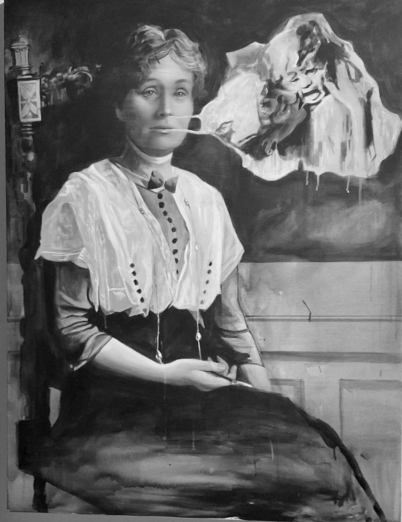 Giulia Andreani, es una pintora italiana que reside en París, sus cuadros evocan el pasado con una perspectiva femenina. Utiliza el color gris de Payne, para reproducir o modificar detalles de fotografías de archivos y recuerdos personales. Su proceso de pintar sobre fotografías produce una sensación de desorientación temporal y permite al artista explorar los estratos de memoria que contiene la imagen. La obra Conservative Ghost, se remonta a la época de las sufragistas británicas del ‘900 y se inspira en Madge Gill, artista autodidacta, quien bajo la influencia de su espíritu guía, Myrninerest, Gill producia un arte forjado por el trauma, por el espiritismo y por el deseo de acceder a reinos de otro mundo. En esta obra la artista explora las afinidades entre el feminismo y el espiritismo como forma sobre puestas de resistencia y emancipación. Estas ideas se cristalizan en el imaginario surreal de una mujer con un libro cómico, donde se ve un niño llorando. Se representa el peso de la maternidad y al peso de las expectativas sociales en el rol de madre. Como su nombre lo indica, se refiere a las estructuras sociales, políticas y económicas del pasado que continúan a dar forma al presente. El cuadro es una invitación a reflexionar sobre los enredos de la historia, del género y de la memoria.