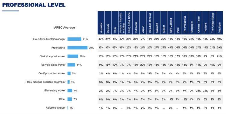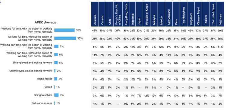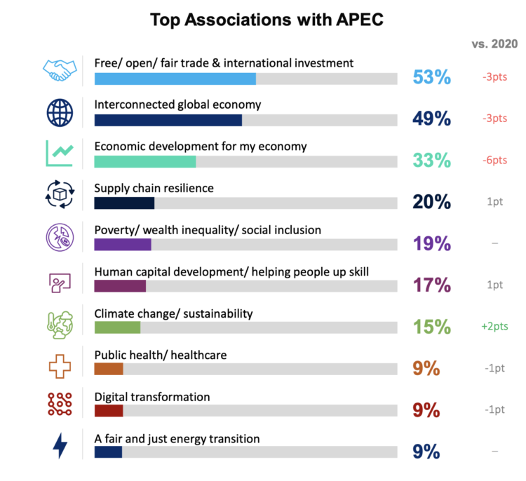 - APEC está altamente asociado y tiene un buen desempeño en el comercio/inversión internacional y en la promoción de la innovación / economía digital. Hay brechas entre las expectativas del público y APEC en la construcción de resiliencia y abordar el cambio climático.