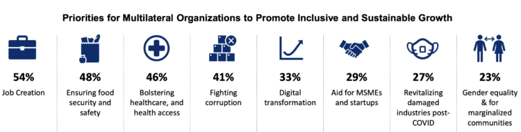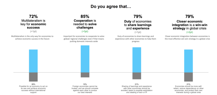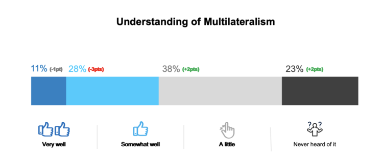 - La comprensión del multilateralismo es limitada, principalmente en lo que respecta a los aspectos del desarrollo económico. Sin embargo, existe un fuerte apoyo de la cooperación internacional para abordar las crisis globales actuales y futuras.
