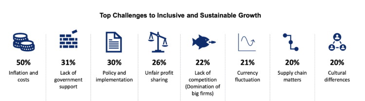 - Además de cuestiones prácticas como los costos y la injusticia, el público tiene algunos obstáculos estructurales para lograr un crecimiento inclusivo y sostenible, es decir, falta de apoyo gubernamental o implementación de políticas.