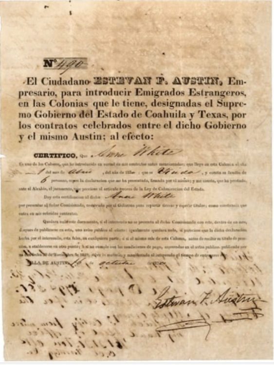 Di fronte all’instabilità presidenziale, spicca la determinazione a popolare il Texas con un unico protagonista stabile, Stephen Fuller Austin, fondatore del Texas anglo-americano, persona determinata nel suo obiettivo, grazie all’autorizzazione del governatore Antonio María Martínez, di continuare con l’impresa di colonizzazione sotto la concessione di suo padre, Moses Austin, dopo aver definito la pianura costiera tra i fiumi San Antonio e Brazos come sito della colonia proposta. L’accordo con Martínez prevedeva l’offerta di terreni ai coloni per un importo di 640 acri per il capofamiglia, 320 acri per sua moglie, 160 acri per ogni figlio e 80 acri per ogni schiavo. Austin addebiterebbe 12 centesimi e mezzo per acro a titolo di risarcimento per i suoi servizi oltre ad essere responsabile della buona condotta dei coloni.