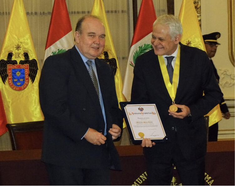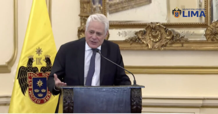 “Querido Embajador, hoy día usted recibe la Medalla de Lima como signo de agradecimiento por todo el excelente trabajo y también el cariño, la amistad, el estar siempre, eso es lo reconocemos en Perú, la actitud y también tengo que agradecer el gran apoyo en su momento de ENEL porque ha sido casi la primera empresa, con su gran gerente que también creo, que en su momento lo propondremos para la Medalla de Lima, porque es una de las personas que más nos ha ayudado. Desde la primera semana ya estaba aquí ¿cómo hacemos Rafael para mejorar la electrificación de estas zonas vulnerables de Lima? llegar a estándares del 99% de electrificación y nosotros estamos trabajando para mejorar la calidad de red de la iluminación también entonces son, digamos, disposiciones, actitudes que se agradecen sobre manera. No es el funcionario que hay que ir a buscarlo, no, él viene, ya está dispuesto a ayudar y me honró ver en el Día de Italia que fue condecorado justamente por el mérito a su labor y a su gran trabajo y al cariño que también se ha ganado en el Perú y le digo “por favor no te vayas”, esperemos que los chinos, que son los dueños ahora, lo respeten y lo dejen trabajar.