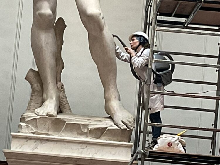 Cada dos meses, el día lunes, cuando el Museo no recibe visitante, se realiza su limpieza. Un trabajo tan delicado cuánto arduo, se evita de este modo que se deposite polvo en su superficie quitándole luminosidad y podría darle una tonalidad gris, esto evita que se desarrollen colonias de biodeteriógenos así como la acumulación de sustancias que son traídas por los visitantes, por el aire, por la humedad que puede originar un daño a la preciada escultura. Por ello, un andamio con varios pisos por donde sube la experta encargada, dra. Eleonora Pucci, quien inicia fotografiando cada parte de la escultura que será confrontada con las anteriores fotos para verificar algún cambio. Luego, ella procede a la delicada limpieza con la brocha de cerdas sintéticas, brochas de diferentes tamaños, con ellas remueve el polvo que inicialmente recoge manualmente, para luego, proceder a su aspiración.