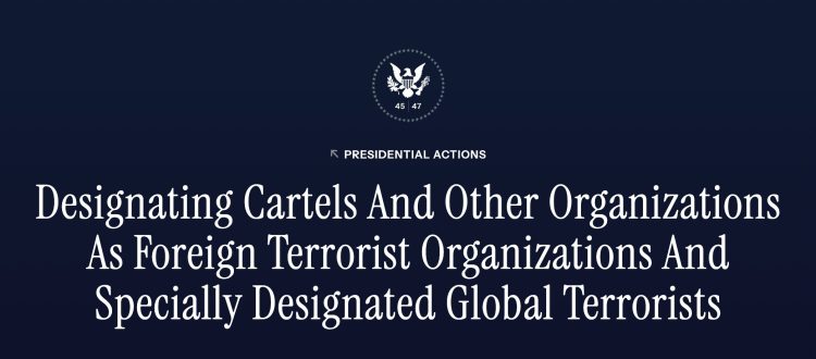 Los cárteles controlan funcionalmente, mediante una campaña de asesinatos, terror, violaciones y fuerza bruta, casi todo el tráfico ilegal a través de la frontera sur de Estados Unidos. En ciertas partes de México, funcionan como entidades cuasi gubernamentales, controlando casi todos los aspectos de la sociedad. Las actividades de los cárteles amenazan la seguridad del pueblo estadounidense, la seguridad de Estados Unidos y la estabilidad del orden internacional en el hemisferio occidental. Sus actividades, proximidad e incursiones en el territorio físico de Estados Unidos representan un riesgo inaceptable para la seguridad nacional de este país.