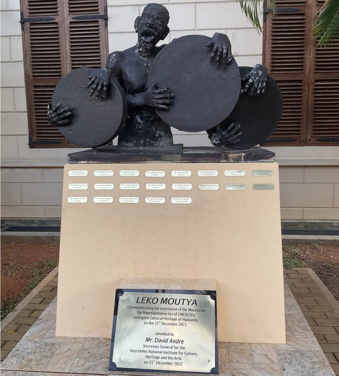 “La “Moutya” llegó a Seychelles con los africanos esclavizados que arribaron con los colonos franceses a principios del siglo XVIII. Solían practicar esta danza por la noche en el bosque, lejos de la casa de la plantación donde vivían sus amos. Históricamente, la Moutya era un consuelo psicológico contra las penurias y la pobreza, y una forma de resistir la servidumbre y la injusticia social. Es una danza sensual con una coreografía sencilla, que tradicionalmente se baila alrededor de una hoguera. El instrumento musical utilizado es un gran tambor con un borde estrecho hecho de piel de cabra, tocado principalmente por hombres. La danza comienza calentando los tambores sobre la hoguera. Una vez calientes, los tamborileros marcan el ritmo y los hombres del público entonan diversos temas, generalmente comentarios sociales, a los que las bailarinas responden con tonos agudos. Hombres y mujeres comienzan a bailar a un ritmo moderado, con movimientos de cadera y arrastre de pies. Los bailarines se acercan, pero sin tocarse. La moutya continúa siendo una forma de expresión de identidad cultural hasta el día de hoy, conservando su forma de danza tradicional. Generalmente se interpreta de forma espontánea en la comunidad, así como en reuniones sociales y eventos culturales. La moutya se transmite informalmente a través de la interpretación, la observación y la imitación, y formalmente a través de la investigación, la documentación y la difusión.”