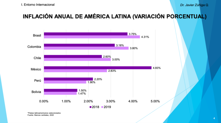 • Bolivia (1.47%), Perú (1.90%), México (2.83%) y Chile (3.00%) son los países con la menor tasa de inflación de la región en el 2019.
